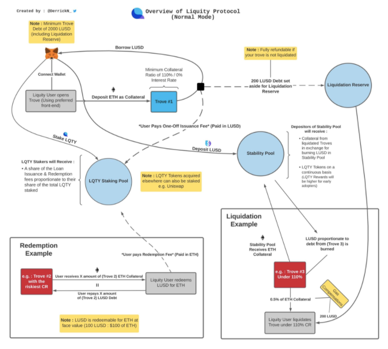 Liquidation Reserve — 만약 청산이 진행되면 가스비가 발생하게 된다. 이 가스비를 충당하기 위해서 각 Trove를 열 때 대출자는 200 LUSD를 Liquidation Reserve라는 이름의 보증금을 내야 한다. 해당 보증금은 부채에 포함되며, Trove가 닫힐 때 대출자에게 온전히 환불된다.